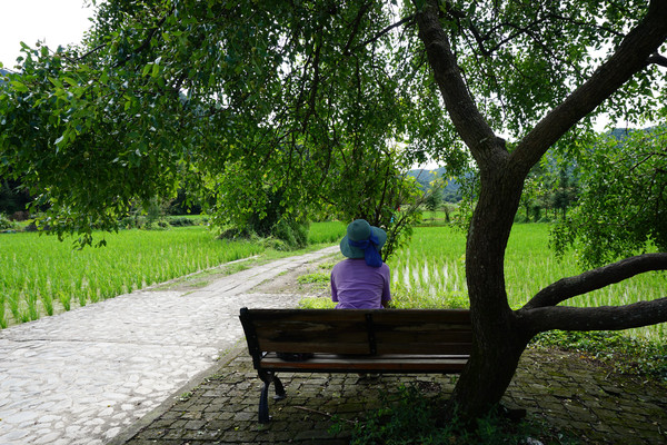 田头,夏天老树枝繁叶茂,为我们撑起一片浓浓的绿荫。同学坐着树下的长椅上好好享受着这份宁静。她平日里的工作就像踩着风火轮的忙碌,少有时间和心情能静下来。我没有打扰她,让她独立享受着当下。