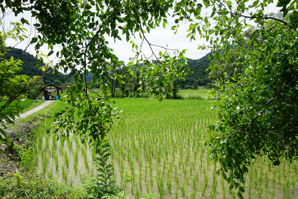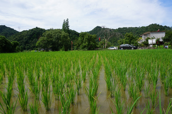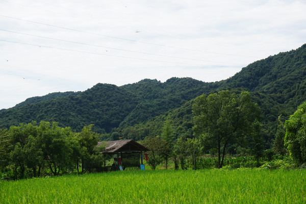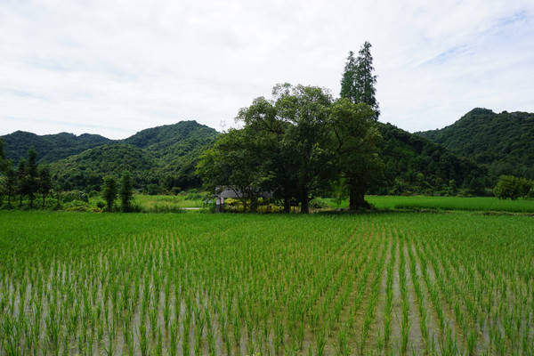 田野中绿树掩映,有刚种不久的稻田像一个个少女亭亭玉立于田间,那轻轻的绿色令夏日多了一份清凉。
