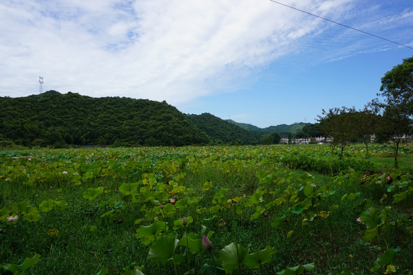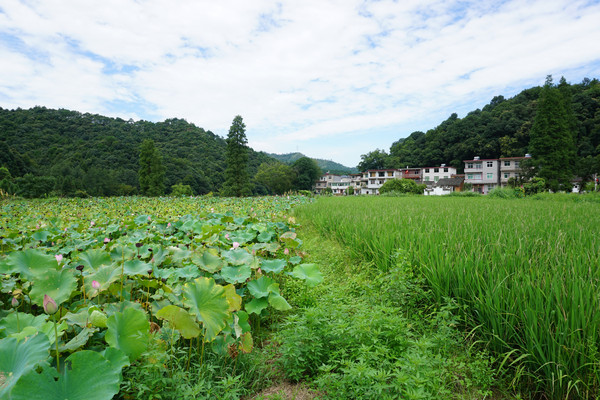透过荷田望向依山而建的村舍,在绿中那白色的屋,粉色的舍是村中那热腾腾的人情味。
