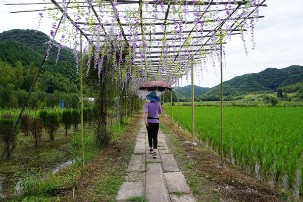 交费过关口。原本纯自然的乡村,原来不应该被分界的土地人为的被收费处划分为两块,有点突兀也有些不自然了。还是这条长石板的田间小路,继续。石板路两侧搭起的花架上是人造花,其实很影响自然景观的。不如直接面对这片本就美丽的田野。这个架子让我想起玉田水库大坝上的那个架子,觉得画蛇添足一词来形容这个现象一点都不夸张。