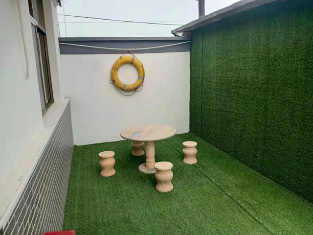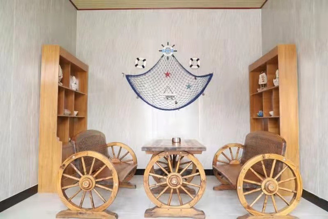 这里不同于现代房屋的千篇一律,保留着渔村特有的海草房、石头墙面的纹理和木质家具,设计大多有鱼、船等文化元素,院角摆放着传统渔具,茶桌上点缀着渔家元素,古老的建筑与自然的生态都给人以原始美,富有生活情趣和渔乡特色。民宿的庭院设计也别出心裁,各具特色,有的以古贝壳堤为原型,将贝壳铺设在庭院之中,尽显沿海特色;有的采用圆拱门设计,通透大气;有的放置木质秋千,童趣休闲,怡性怡情。