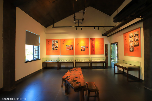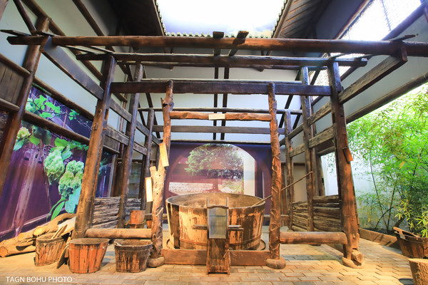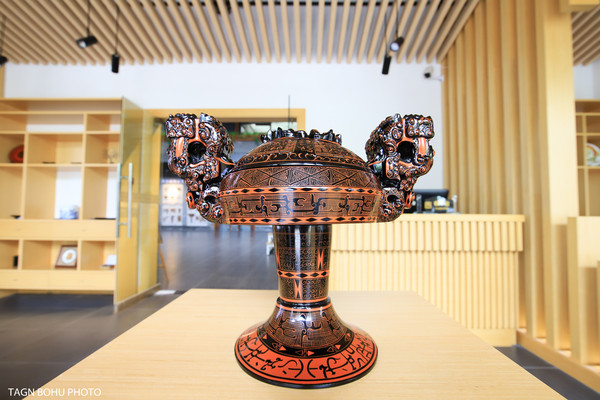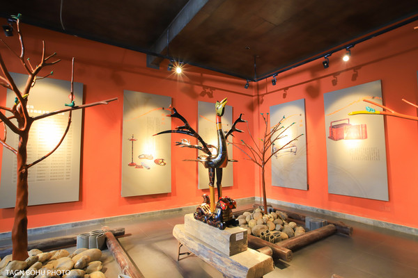 漆器神树,楚文化生命崇拜的象征,再往里面走看到古代大漆的制作坊,一道道工序所使用的工具呈现在眼前,漫步在走廊中,又来到了一间用大漆制作展厅。