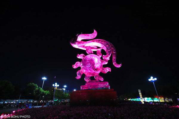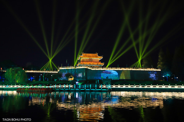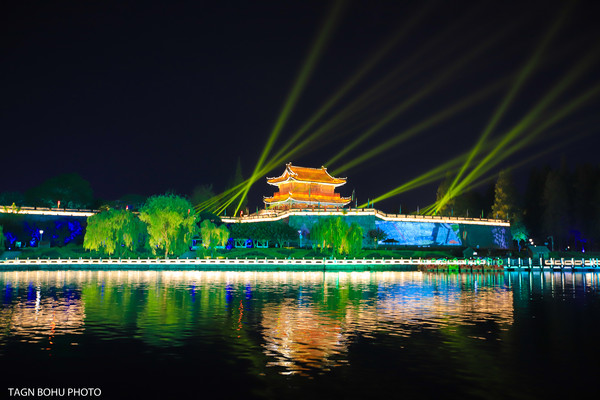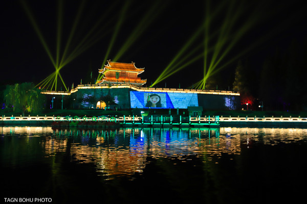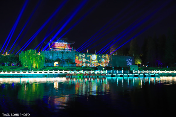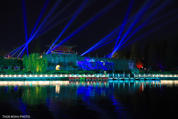 没过一会儿,在岸的另一边灯光,声音同时响起,精彩的光影秀就开始了,古城墙上发出五颜六色的光线照在天空上,不时的变动的方位,古城墙墙面上投影着各种画面,从古代到现代,随着音乐,声音的不停的变换着画面,让我们更了解了古代荆州的一些故事。