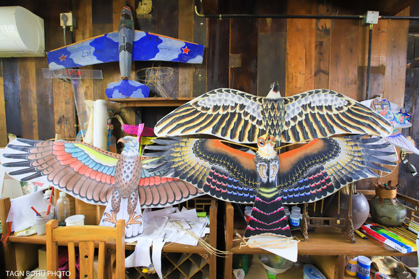 磨鹰风筝的制作,是一门集扎、糊、绘、放的传统技艺。要制作磨鹰风筝,首先要画稿。设计出符合空气动力学原理的各个部位,要求比例合适,材料扎实。一般磨鹰的骨架由韧性好、强度高的竹子制成,其他部分,由丝绵纸制成。