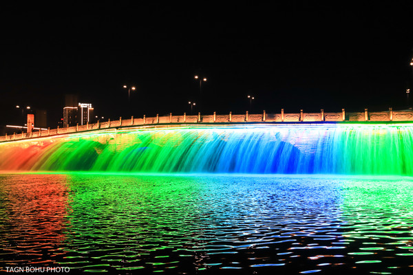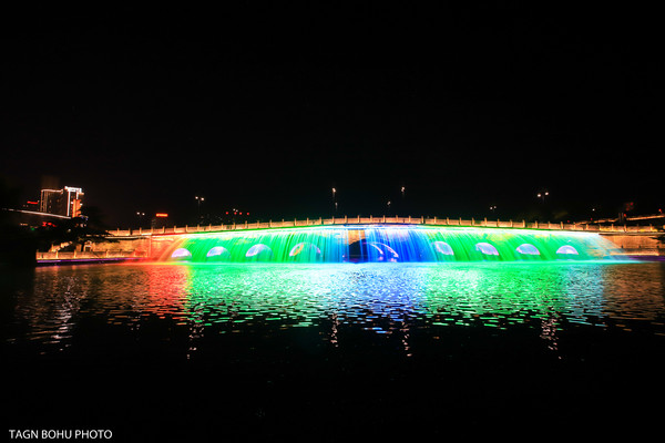 在荆州每天晚上都有光影秀演出,而且是免费观看的,傍晚的时候,华灯初上,我们早早就来到了古城墙外,欣赏光影秀最佳的玩法就是坐上船,沿着江边转一圈,在江上欣赏光影秀是最好不过了。灯光秀还没开始前我们就提前坐上了船,船慢慢地沿着江前行着,经过九孔桥,那五颜六色灯光照在水面上犹如彩虹般一样。