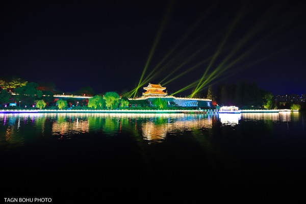 傍晚,华灯初上,荆州古城宾阳楼在灯光的照射下光彩夺目,坐上船夜游两岸,赏光影秀,美哉。
