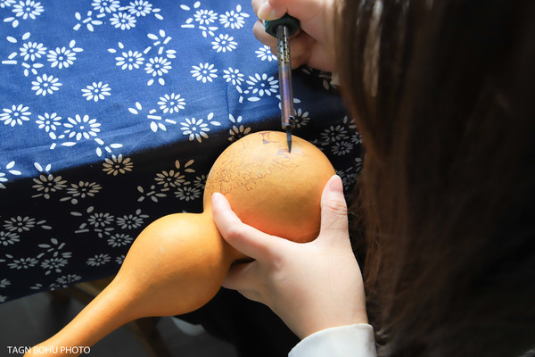 用火烧热烙铁在葫芦上熨出烙痕作画。烙画创作在把握火候、力度的同时,还要多注意作品本身的问题。看到一位学生正在烙印作画,一边拿着葫芦,一边拿着烙。就这样慢慢的在葫芦上作画。