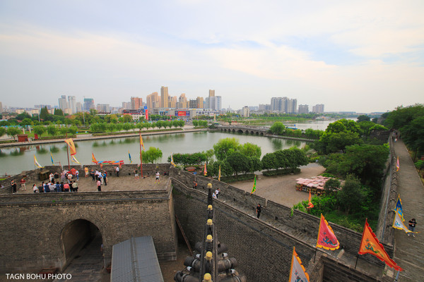 先登上古城墙的第一个城门叫宾阳楼,这个楼可以上去,从楼上的阳台望去,一边是现代的高楼大厦,而在另一侧看去是古城内的建筑,一条长长的石板路贯通着城门到城内的路。站在这里仿佛看到了当年那段繁华的街景般。