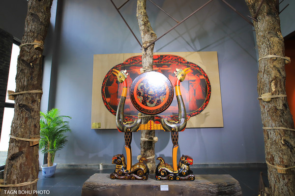 走进中国第一家荆楚非遗技能传承基地——荆楚非遗传承院,一进去就看到荆楚文化代表虎座凤架鼓。这里汇聚了楚绣、烙画、楚式漆器、磨鹰风筝等这些散落在民间“非遗珍宝”。