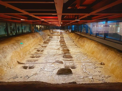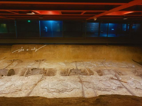 荆州“车马阵展厅”是在考古发掘遗址上直接修建的,占地8200多平米,内有四十多座气势恢宏的车马坑,是目前国内发掘出车马殉葬规模最大的一处遗址。