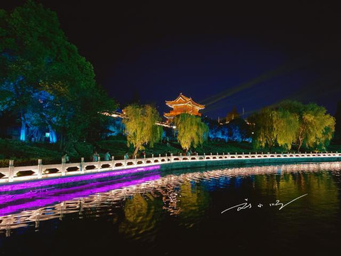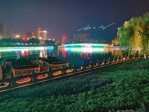 “荆州古城墙”外的护城河也同样装点了五颜六色的灯光,倒映在水里,与古城墙上的灯光秀遥相呼应,如梦似幻,也可以说是美轮美奂了哦!