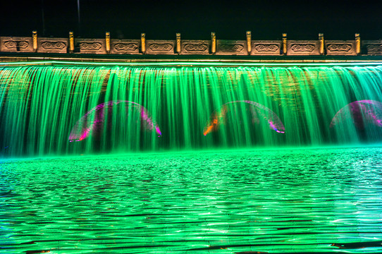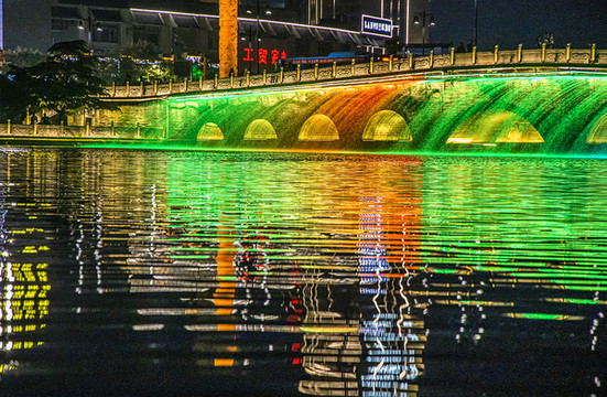 城楼上的灯光,九龙桥上喷水,护城河边的流光异彩,再加上五颜六色色彩斑斓的灯柱,简直是美轮美奂,好看极了!