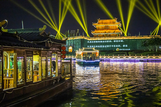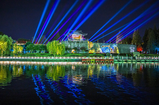 夜游古城新亮点,船游护城河观看,现代科技光影秀。每天两场每8分钟。通过向游人展示荆楚人文景观,弘扬三国文化底蕴,从而宣传发展古城荆州,未来可期,说不定过不了多久荆州古城就成了全球人们心中的网红打卡地!