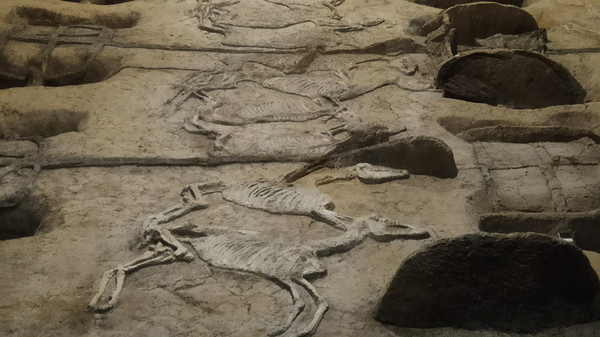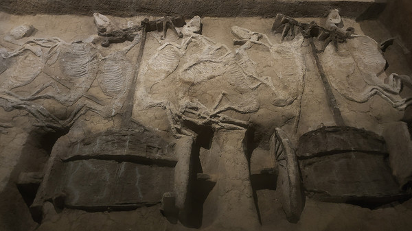 马骨虽然只残留骨痕,但是马的头骨、四肢骨、推骨、肋骨都一目了然。由车辆形制分析。那时基本上员同种类型的车放置在相部近的位置。其中六马驾一车的有三乘,按周礼这是天子的驾车六。虽然这个一号大车马坑还有三分之一并未发掘,但是按照其中轴对称的特点,专家推测整个大车马坑一共葬有车辆66乘,马匹258匹,规模宏大,令人惊叹!