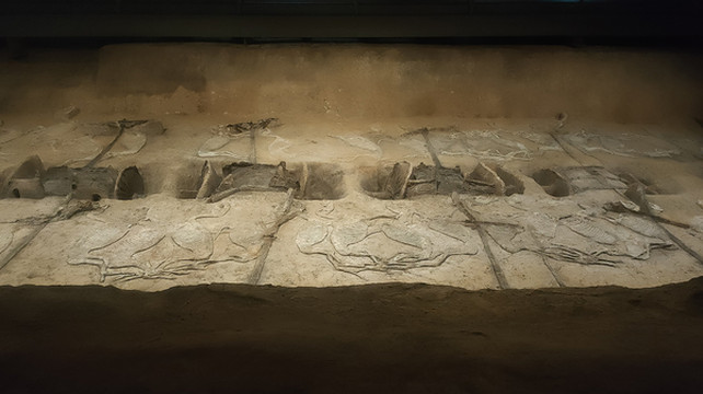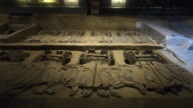 荆州“车马阵展厅”在考古发掘遗址上直接修建,是目前国内发掘出车马殉葬规模最大的一处遗址,其中,一号车马坑是目前全国发现最长的车马坑,经过最近这些年的考古发掘,已经清理出了这座大车马坑中三分之二的部分。一号车马坑即大车马坑,为长方形穴士坑,目前已发大车马坑北部79米长度的范国,面积950平方米,共出土车43延,马164。虽然经过将近2000年的水土侵蚀,出土的车马仍然保存较好,车上原来涂的油漆、绘制的花纹依然请断可见。