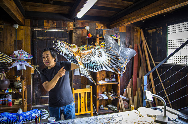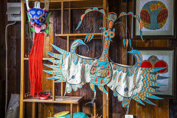 比如在:磨鹰风筝馆内,我们了解到“磨鹰”风筝的制作过程,听技艺师傅现场给我们讲述:是集扎、糊、绘、放传统技法之大成,即鹰头、身躯部造型突出高挺,双眼部镂空并装配亮彩且能转动的“活眼”物体,巧借风力闪转灵动。在风筝抖线结构上,采用一个支点、一根抖线的独特技法与结构。在抖线安装上,在身中点偏左或偏右的区位安装抖线,而呈现出暂不对称之状,从而为“磨鹰”升空后盘飞并实现平衡,都是非常具有智慧的。