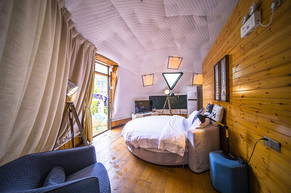 每种住宿房型,都要自己的特色,有适合亲子的、聚会的、情侣的,总之选择多样,每种都让人惊喜。共有15间树屋、5间木屋、4间野奢帐篷、5间观星帐篷、5间房车花园酒店,还有露营小帐篷。当然旁边还有个洈水假日酒店也很不错。