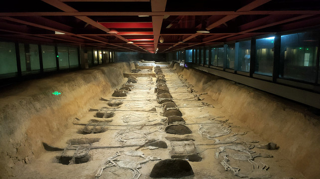 关于中国古代车马埋葬制度:相传黄帝“服牛乘马”,夏朝“奚仲作车”,考古发现二里头夏文化有车辙,商代晚期有车马殉葬。周代礼制规定从周王到诸侯、卿大夫,依身份不同在车子的结构与装饰、驾马的数量、车马器的形制等方面有严格区别,随葬车马的规格是身份等级的重要标志。出土东周马车一般为独辀(zhou单辕)车及双马或四马驾车,大量战车用于殉葬。