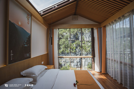 玩在地心,睡在悬崖。崖舍悬崖玻璃酒店的房间就“悬挂”在地心谷的入口处,356米的悬崖绝壁之上。背靠群山,面朝峡谷,高低错落,远看仿佛是青山绿水间的童话小屋,从空中和对面看都非常震撼。从房间里拉开窗帘,面对的就是地心谷的悠悠深谷,还可以遥望玻璃吊桥,视野极佳。每个小屋还都有个阳台,三五好友,一杯清茶,与自然零距离接触。透过屋顶的玻璃天窗,既可以享受无遮拦的阳光,又可以在夜晚躺在床上看星星。银河夜空尽收眼底,伴着月光虫鸣入眠。