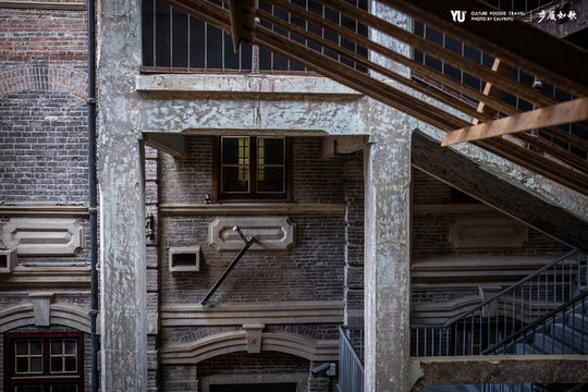 在距离江滩观江台几百米的地方,是始建于1905年的平和打包厂旧址,最早作为英商在汉口旧租界内建立的加工打包仓库存在。它多次扩建,形成现在的拥有6栋单体建筑上百间房屋的规模。从英商仓库到武汉商业储运公司仓库,再到如今的武汉市优秀历史建筑、一级工业遗产,平和打包厂旧址变为了对外开放的艺术园区。藏在古朴建筑里的房间,如今成为咖啡馆、书店和艺术设计公司,昔日的红砖大楼墙壁斑驳,木框窗子整整齐齐地反射着傍晚的阴影,铸铁的栏杆和装饰物投射着建筑结构的力量。