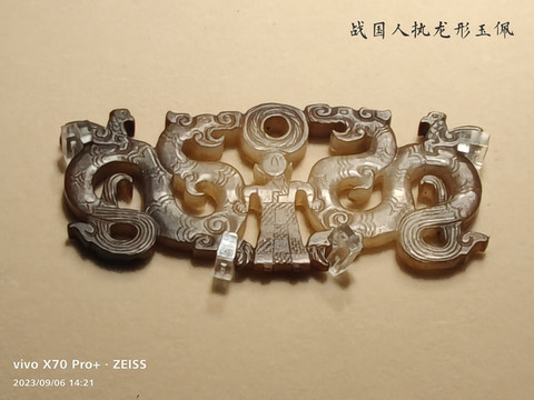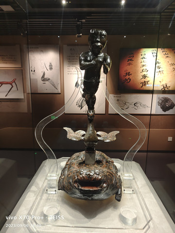 战国彩绘漆木蟾座凤鸟羽人,由羽人、凤鸟、蟾蜍组成。人面鸟喙羽人并足立于凤鸟头上,凤鸟展翅踏于蟾蜍背上,造型独特,体现了楚人神秘的宗教信仰。