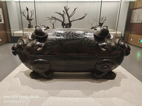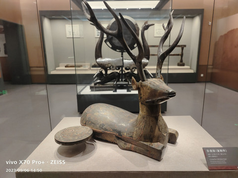 卧鹿鼓,是模仿自然界中梅花鹿的形象来进行雕刻创作的。《诗经•小雅•鹿鸣》:“呦呦鹿鸣,食野之苹。我有嘉宾,鼓瑟吹笙。”《鹿鸣》是东周贵族宴饮时经常演奏的乐曲。楚人以卧鹿作鼓架,是想在听到鼓音的同时,感受到“呦呦鹿鸣”的声音。
