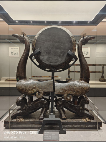 战国彩绘漆木虎座凤鸟悬鼓,高1.7米左右,宽1.45米,双虎为座,双凤为架,凤冠悬挂乐鼓,猛虎作势前扑,翔凤振翅欲飞,气势恢宏。