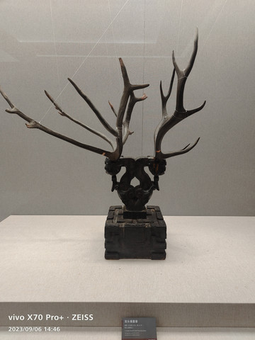 双头镇墓兽,雕刻的是两只相背的兽类,最突出的就是它们头上的巨型鹿角了,枝节盘错,气势雄伟,怪诞而神异,仿佛这对角真的有一股神奇的力量一般。