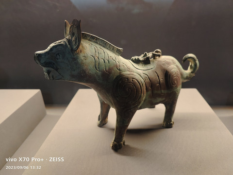 虎座飞鸟,以蹲伏状的猛虎为座,神态威严,虎背之上立有昂首展翅的长颈凤鸟,仪表轩昂,凤身生出一对锐利的鹿角,极具审美艺术价值。