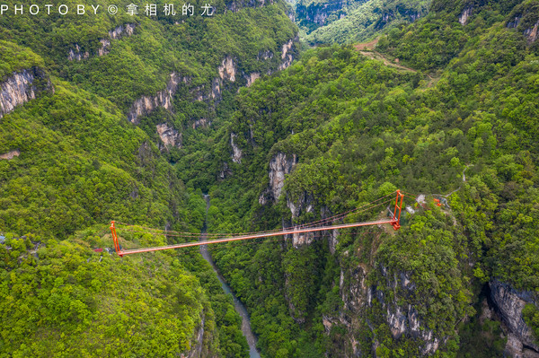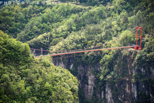 悬崖索桥全长220米,高差230米,相当于70层楼的高度。中间12米长的玻璃栈道惊险刺激。它既是景观桥也是观景桥,唯有站在桥上才可领略著名的象鼻山风貌,两岸风光尽收眼底。