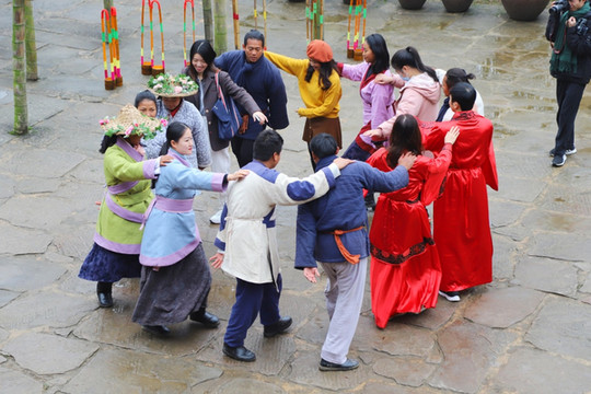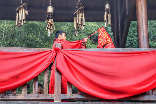 抛绣球会是第一个环节,新娘子站在二楼将绣球向属意的方向抛去,而接到的男士则要上楼换上新郎服,和新娘子“拜堂成亲”!