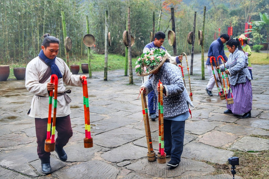 其后“夫妻双双”下楼,和竹篼舞演员一起,载歌载舞,完成整个“婚嫁”礼仪。