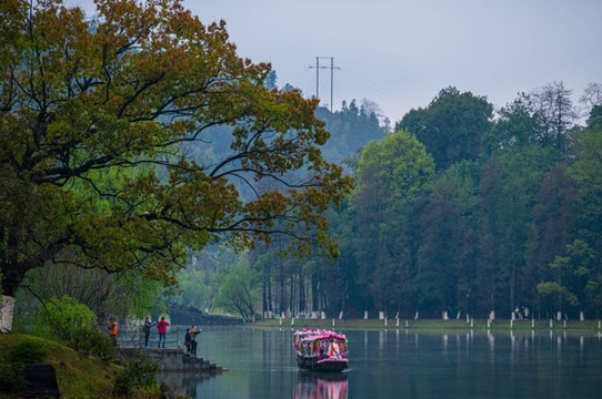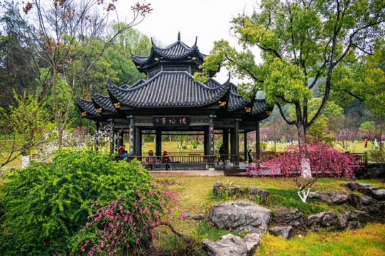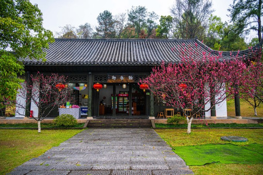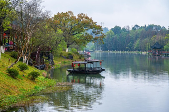 另外湖边上还有许多的亭子和牌坊之类的建筑,都是与《桃花源记》有关,拍照取景也是格外的好看。累了、雨下大了还可以找地方歇一歇。对了,在一些商铺里不但可以买到景区纪念品,还可以租到汉服,如果是没有汉服的姐妹想来拍照,在景区现租就可以了。