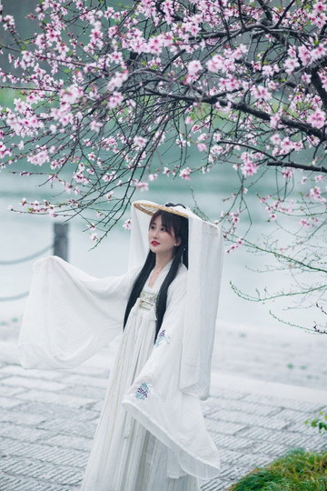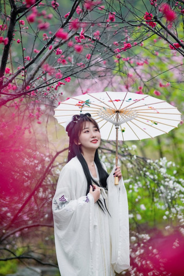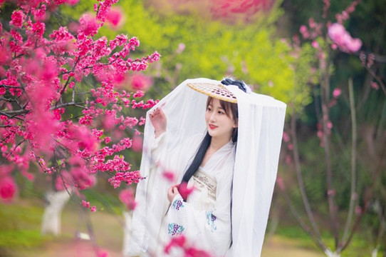 接下来就来看看我给楠妹拍的汉服照片吧!桃花源里的桃花有我们常见的粉红色,也有大红色的,所以楠妹带了一套纯白色的汉服是非常合适的,颜色有一些对比,且显得并不突兀。选景由我来完成,不管是站在树下,还是躲在花丛中都可以拍到很不错的照片。
