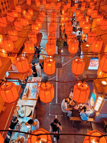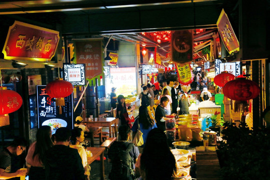老街分为两部分,一部分是非物质文化遗产的缩影区。另一部分是美食区,名曰: “食有捌玖”,汇集了关中仍至全国各地的名优小吃。黄昏的时候,老街上人头攒动,巷子里传出的香味,连接过去与未来。风靡三秦大地几百年的关中老点心,王记黄灿灿的涮锅油饼,酸香爽口的酸菜拌汤,七十二次捶捶打打的洋芋糍粑,一块豆腐千种滋味的陈先生豆腐,百年美食馓子麻叶……全国的名优美食小吃,在这里都可以品尝到。 极具特色的各种美食,刺激着人的味蕾,那种从美食中获得的满足感,足以愉悦人的心情。