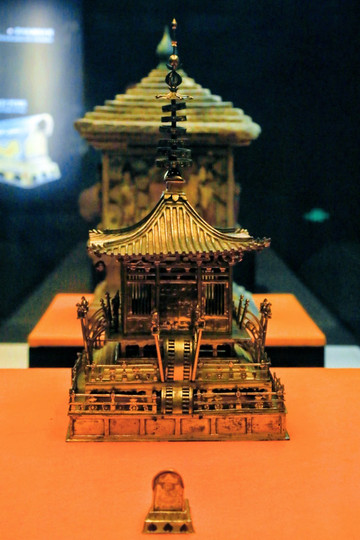 在旁边的珍宝馆(也称博物馆)内,展出了地宫出土的文物精品。你能够观赏到唐皇室供佛的上百件珍宝,件件都让人为之惊叹。其中有:安放舍利的八重宝函、十二环锡杖、纯金塔、汉白玉灵帐、秘色瓷、皇帝使用的茶具等等。这些珍宝有的是用纯金打造,有些珍宝的制作工艺已经失传,有的是全世界仅有的,体现了当时唐帝国的极度富有和皇室礼佛的一片诚心。