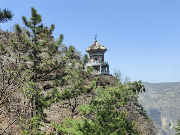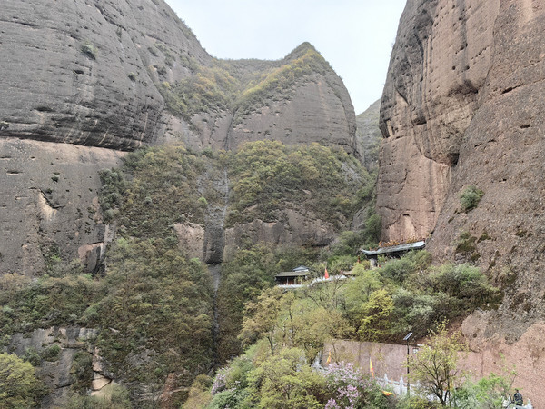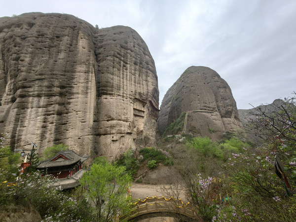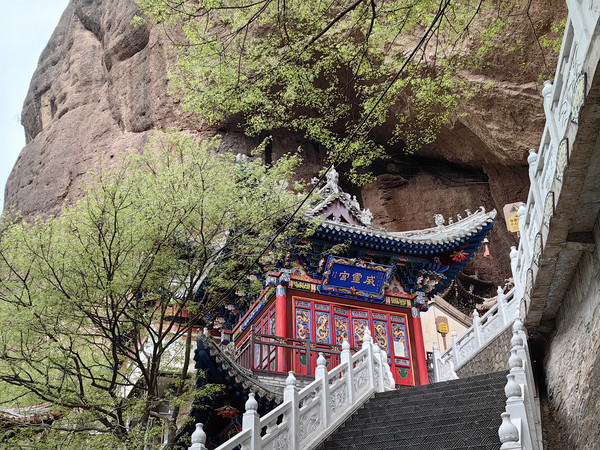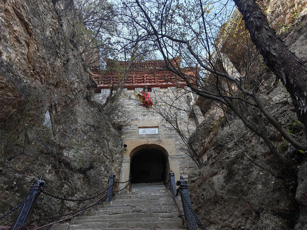 沿石阶前行,皇城的右侧下方有一道莽龙般点缀在悬壁峭崖上的建筑群落,这便是崆峒山另一处著名的古建筑群-雷声峰建筑群。