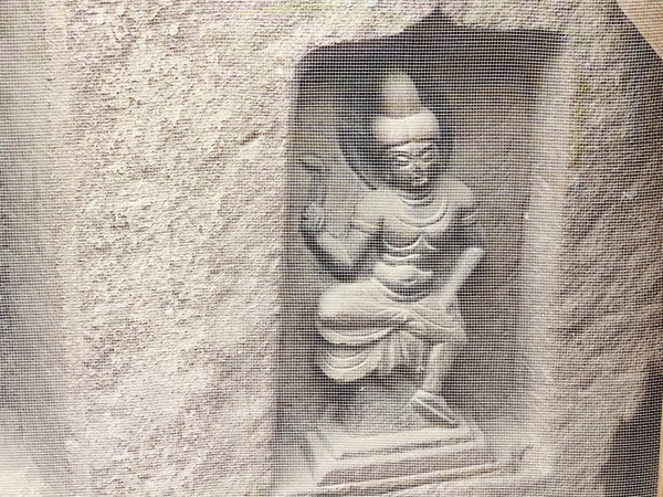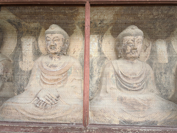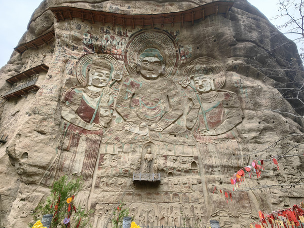 在陡峭的崖壁上有浮雕3尊,中间的大佛高达40余米,两旁是手持莲花躬身肃立的胁侍菩萨。佛坐莲台上,莲瓣间层刻有狮、鹿、象,或站或卧,排列对称,雕琢古朴,形象生动,造型艺术水平较高。周围诸多佛龛伫立着宋代小佛像。崖面上部向前突出,又加筑风檐以蔽风雨,檐端雕刻飞云走兽,悬挂铜铃,微风过处,叮铛作响。其造型留有小乘佛教的痕迹,在我国石窟艺术中实属罕见,是研究我国早期石窟文化的重要资料。