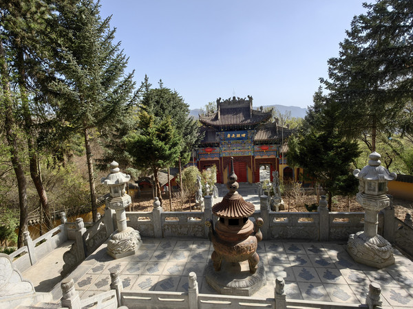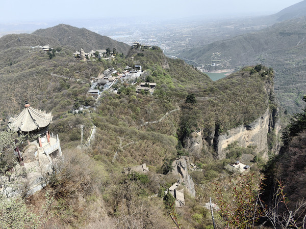 沿石阶继续下行到达中台,沿途经过许多大大小小的殿宇。每一建筑单元在峰、峦、坡、崖、涧的不同位置上,借助于自然景观的雄伟高大或奇峭幽深,就地取势,构造出不论单体或整体上独有的仙山琼阁的幽远意境。