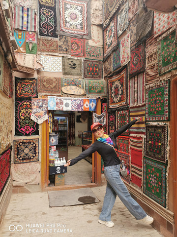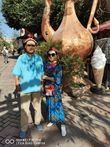 D2、按照房东介绍,上午的免费的迎宾仪式表演是10点半开始约半小时。我们早早的9点钟,这如同内地的早上7点钟,街上人很少,就来到了早餐摊点,人均9元吃了早餐。之后沿老街蜿蜒朝东门步行而去,大约二十分钟基本就到了,临近时在一家衣帽店,一人买了一身维吾尔族民族服装和帽子均90元,穿上它更显隆重的仪式感。