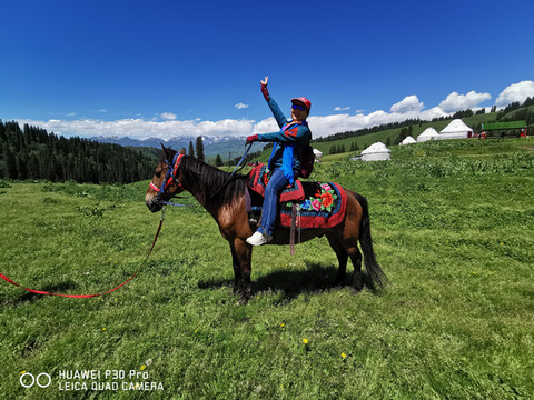 D12、早饭后,依然是导游带着司机师傅开着中巴车来接我们了。一路无话直奔恰西草原附近的农家乐,一盘香香的新疆手抓饭,填饱肚子好登山。导游买好门票带送我们进入景区,乘坐景区交通车到广场,大家就可随意走入原始森林、草原、河流,还可以骑马玩乐,这里也是自驾游的营地,房车、帐篷随处可见,到也是一个风景,大在此体验着大自然的美好馈赠,空气、景致都是那么的赏心悦目。