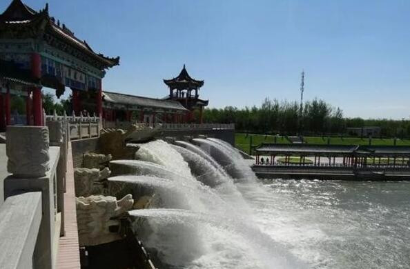 这就是克拉玛依九龙潭景区瀑布,瀑布水源来自风克干渠湍急的水流从中间的一条巨龙口中喷出,利用水的喷涌速度和自然重力形成宽约10米的巨大的瀑布。