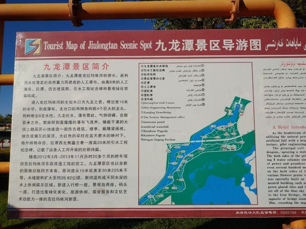 它从阿尔泰山脚下长途跋涉跨越戈壁荒漠来到克拉玛依给予缺水的油城带来绿色和生机它就是克拉玛依河。克拉玛依河又名穿城河,起自克拉玛依市城区东北的九龙潭,在城中曲折横穿进入城区西南的西月潭(又名阿依库勒)水库,全长8.51千米,河宽15米,水深1.8米至2.3米。 九龙潭是克拉玛依河的源头所在,地处克拉玛依河穿城风景带之首-东郊瀑布景区内。该景区主要由高约8米的人工瀑布、瀑布下的巨潭和周围大面积的绿化林带草坪构成。