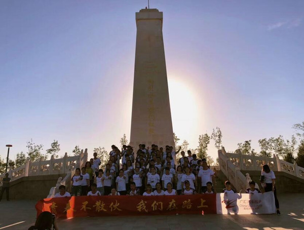 一群青春青春不散我们在路上的有志青年在和引水工程纪念碑合影留恋