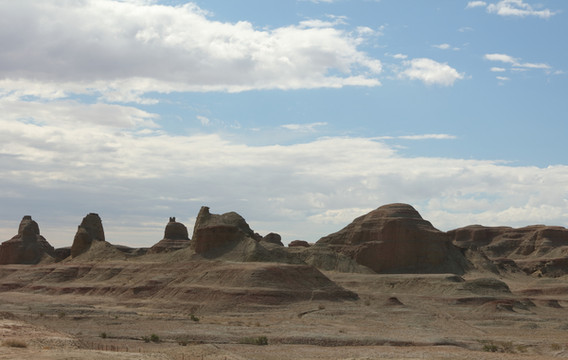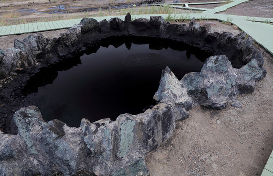 克拉玛依位于赛里木湖和喀纳斯湖中间,我们把它作为休息站。克拉玛依维吾尔语为“黑油”,得名于市区东北角一群天然沥青丘--黑油山。它是地下原油经过长年自然喷发外溢,凝结和风化而成的沥青沙丘,由被石油浸染的砂岩或被石油凝结的砂砾岩构成。整个山丘呈黑褐色,地表凹凸不平,有多处油泉和油泡不断涌出,形成众多小油沼。黑油山开辟成景点,不收费,但也建了大门、游客中心等,还有几个外形像管道一样的房子,不知是做餐厅还是做什么,孤零零地立在一边。像这种在市区内的景点搞这些配套设施纯属浪费。