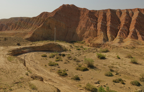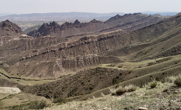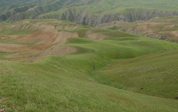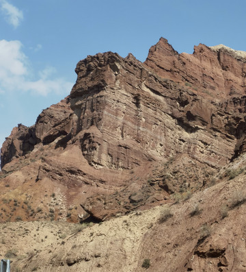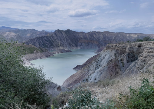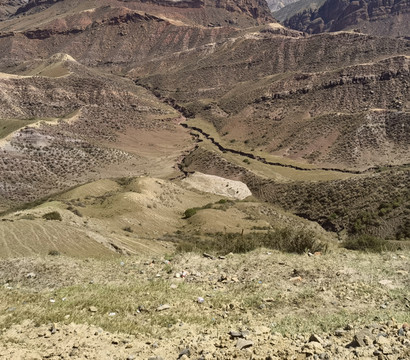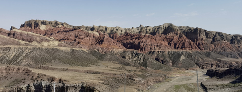 从乌鲁木齐到独山子有两条路,一是连霍高速,两个多小时就到。另一个是S101,途经康家石门子百里丹霞、石门子岩画、肯斯瓦特水库、安集海峡谷和独山子大峡谷等。边玩边走能走一天。这条以前的战备路说是简易道路,其实大部分路很好走,只是路标少些,而且几处岔道容易走错,我们走错了两次。这条路车少,停车拍照极方便。从乌鲁木齐出来天气晴好,走不远就见到一个横跨道路的大门,这里就是百里丹霞的起点。路两边红色的山丘连绵不断,红色中间整齐地夹着黄、绿、白等其它颜色,像彩色蛋糕。有些山看上去坚硬,有些松软,山形有的尖利,有的舒缓,蛮有趣。肯斯瓦特水库在路的中段,水是绿的,典型的北疆颜色。以肯斯瓦特水库为界,东边荒凉,没见到什么人。西边水草肥美,牛羊成群,村落相连。过了水库天气转阴,越来越沉,直到开始下雨,雨雾交加,有时能见度不足10米。所以后半段的景都没看。据说安集海大峡谷是这一路的精华。