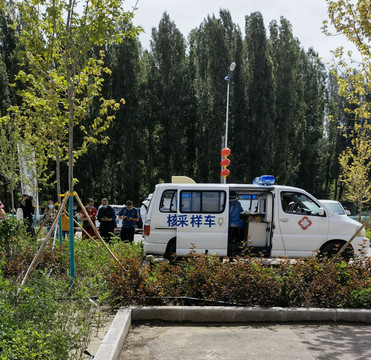 离开那拉提向西到特克斯。天气晴朗起来了。中午在路上被拦下做核酸,这天是全体核酸日,烈日下排队一小时才做完。这么多天阴天下雨,偏偏今天万里无云,是怕我们长毛呀!
