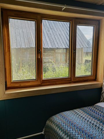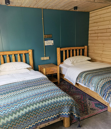 金泰的经理给我们介绍了禾木的不舍民宿,这是我们唯一没提前预订的地方。小院在村子最里头,离禾木桥有点远。两排面对面的房屋有大床房、标间和家庭房。房间面积不小,床很舒服干净。淋浴又热又冲,电热水器很足,淋浴器开关高级到我不会用。只是下水不畅,水流了一地。好像民宿还在完善中,门前的步道还没铺好,我们进门要踩一段泥路,门也没有锁,从里面可以插上。