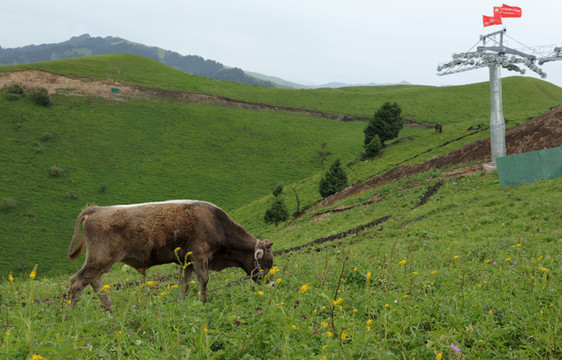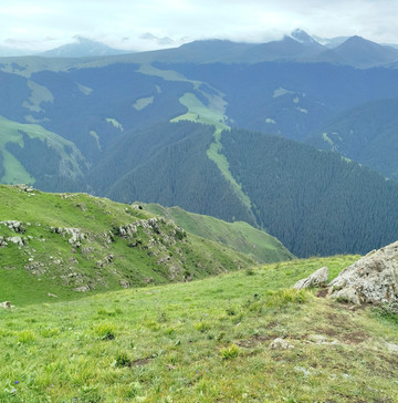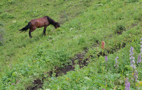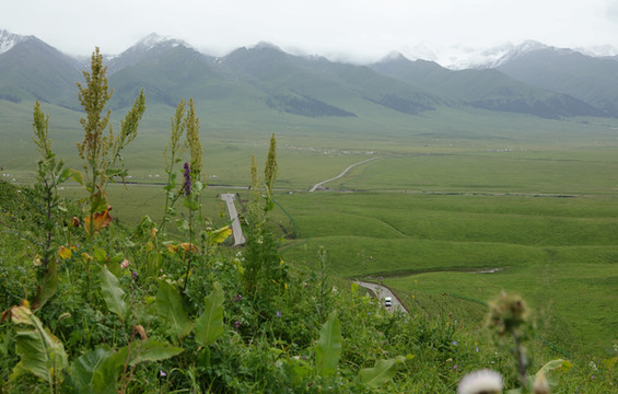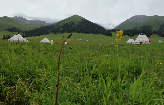 我们错失了巴音布鲁克,第二天一早赶往那拉提,天气依然不好,时不时落几滴雨。我们决定先入住吃饭,下午再进景区。那拉提是哈萨克人的夏季牧场,三面环山,地势由东南向西北倾斜,巩乃斯河蜿蜒流过。传说成吉思汗西征时,有一支蒙古军队由天山深处向伊犁进发,时值春日,山中却是风雪弥漫,饥饿和寒冷使这支军队疲乏不堪,不想翻过山岭犹如进入了另一个世界,眼前一片繁花似锦,艳阳高照,士兵们不由地大叫“那拉提(有太阳)!那拉提!”