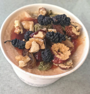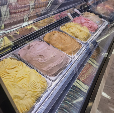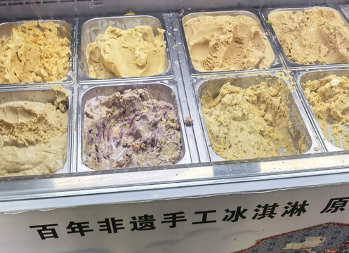 古兰丹姆冰激凌名气很大,我们在寻找它的路上遇到了另一家百年工艺冰激凌店,买了两个尝尝,奶油较轻,甜度很高。古兰丹姆门口排了十多人,可见受欢迎。很快进到店里,店面很大,有主厅、侧厅和院子,都有桌椅。在主厅的柜台排队点餐,取冰激凌。除原味外,有几种果味的,还有双拼和三拼,还有奶茶、酸奶、蛋糕等几十种花式甜品,价格以二十多元为主,原味仅9.9元。拿着冰激凌从中间的自助台上自选干果和果酱。最后找座位坐下享用自己调配的冰激凌。冰激凌同样奶油比较轻,但甜度也不太重。我觉得味道不错,但也没有那么好,自调口味的过程有趣,值得一试。